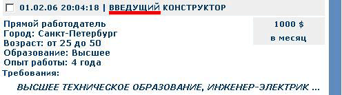 Тут в одном заведении со страшной силой ищут конструктора, способного вводить, рассказал Сергей. Правда, зачем ему при этом высшее образование - не понятно!
