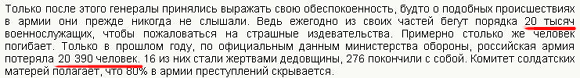 Сайту Inopressa.ru числа 1000 с чем-то человек показалось маловато, рассказал CLR. Поэтому они его умножили на два. Посмотрели - получилось 2 с чем-то тысячи. Тоже маловато. Тогда, махнув рукой, увеличили на порядок - и так опубликовали. Получилось, что в год в России гибнет больше солдат, чем за весь Афган. Но зато заметка теперь выглядит солидно. А что нолик лишний, так это мало кто знает...