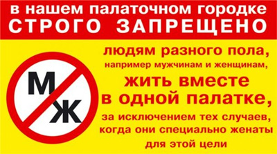 В табличке из палаточного городка особено доставило примечание мелким шрифтом: "например мужчинам и женщинам". До сих пор сижу и пытаюсь представить другой вариант "людей разного пола". В голову приходят разве что обладатели квартир с паркетом и с линолеумом.