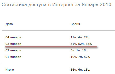 Максима всегда радовала точность билинга у "Билайна". Там аж до секунд. Например, 3 января он просидел в Интернете 31 час 52 минуты и 33 секунды.