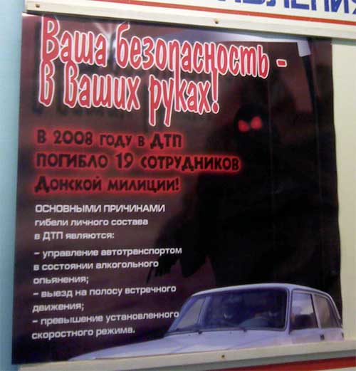 Nerezon сфотографировал этот плакат в отделении милиции. Приятно, что милиционеры честно называют причины гибели личного состава в ДТП. Но одновременно жалко, что среди этих причин нет строчки "погоня за преступником". Видать, они только и умеют, что нажираться водки и кататься по городу, нарушая правила движения.
