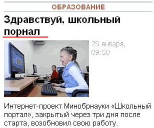 Статья : "Значительных изменений во втором варианте "единой для всех школ стартовой страницы" не наблюдается: она по-прежнему не защищена от порноресурсов, в чем легко убедиться, введя в поисковый шаблон невиннейшие слова." Ну и далее на эту тему.
