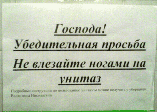 Но лучше бы смотрелось обращение: "Глубокоуважаемые леди и джентльмены! Не влезайте ногами на унитаз! Не писайте на пол! Не раскуривайте окурки, брошенные в писсуар!"