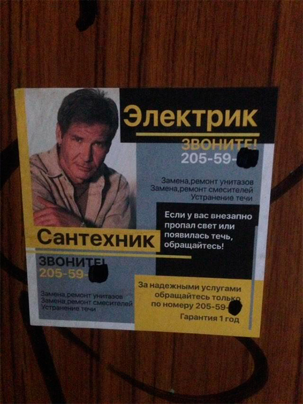 И тут реклама некорректная. Всем известно, что Харрисон Форд никой не электрик-сантехник. Он - плотник!