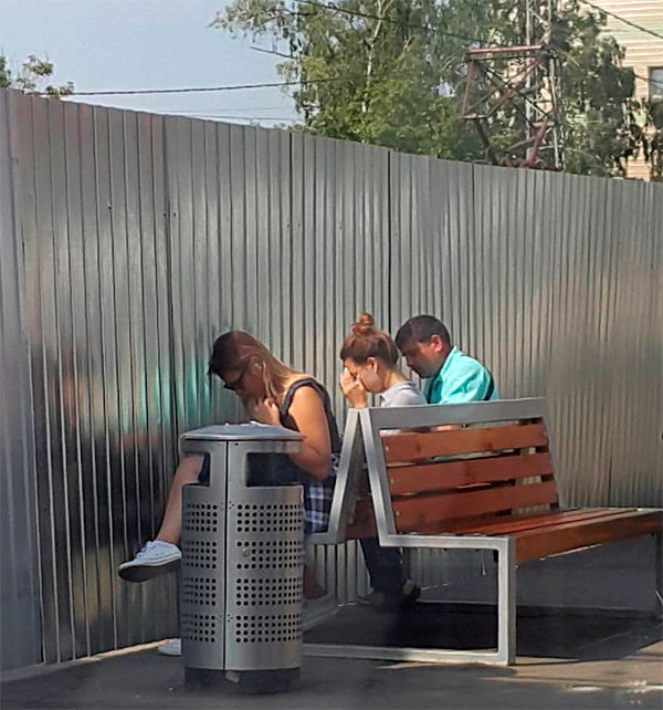 Скамейка... Ну видно же по фото, что люди так сели, потому что там тень, девушка рукой даже прикрылась. Ну, наверное, в прячущихся от солнца людях можно увидеть что-то смешное, да )))