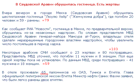 В общем, все сходится. В гостинице жили 65 паломников, из которых погибли 20 и 59 ранены. Хотя на самом деле пострадавших было не 79, а 80. Оставшиеся -15 паломников отправились на хадж. Включая легкораненых египтян.