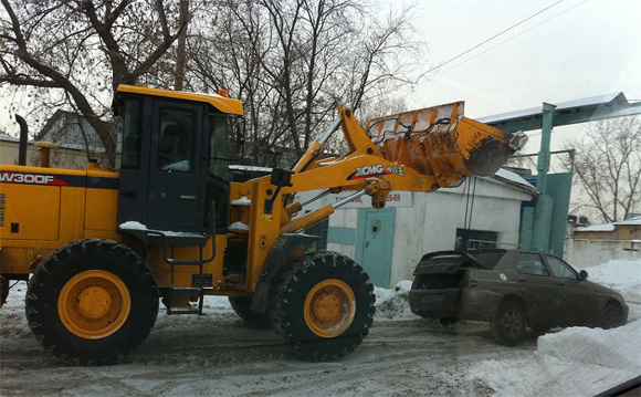 Голь на выдумки хитра, рассказала Ирина. Поначалу вроде кажется, что десятка тащит экскаватор - ну, типа прикурить дает. Потом становится видно, что экскаватор на самом деле заменяет десятке левое заднее колесо - ну неохота мужику ставить запаску, вот так и едет до шиномонтажа.
