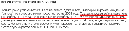 Таинственный Вага (вероятно, Вага Колесо) предсказал конец Светы, ужасается Darcus. Ну и радует то, что сроки третьей мировой войны указаны совершенно точно, а тот факт, что Олимпиада в Сочи все-таки состоится, радует еще больше: значит, не все разворуют, оставят пару стадиончиков и кусочек олимпийской деревеньки.