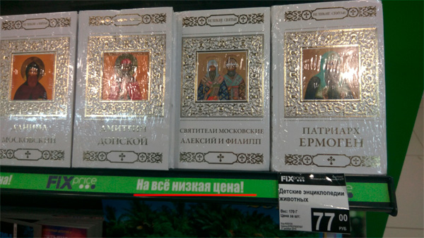 На фотографии с книгами о святых вообще-то самое интересное - это ценник: "Детские энциклопедии животных"