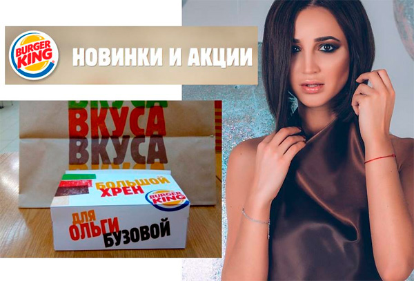 Игорь восхищается пиарщиками "Бургер-кинга". Они с каждым разом все упорнее и упорнее доказывают, что их заведение - для законченного быдла. Все эти "обострись", "наедалово", а теперь вон большой хрен для Ольги Бузовой, которая, судя по всему, разошлась с мужем по причине маленького хрена. Слышь, Бивис, тут продают большой хрен для Бузовой, гы-гы-гы-гы...