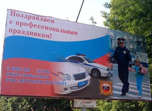 Денис тронут этим плакатом. Гаишник переводит по "зебре" девочку, чтобы ее не задавили другие гаишники. Как мило!