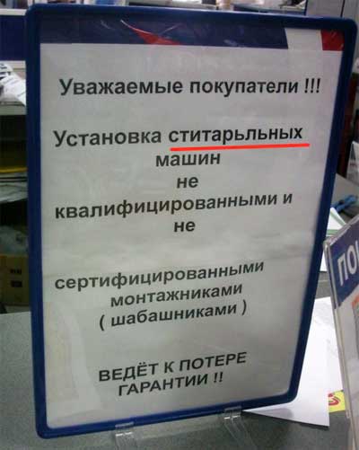 У меня только один вопрос: кого они вообще шабашниками назвали с таким объявлением? Кстати, теперь никто не мешает устанавливать стиралку с помощью неквалифицированного специалиста. "Ашан" ведь запретил устанавливать только ститарьльные машинки... Объявление, видать, писал сильно "уставший" квалифицированный специалист.