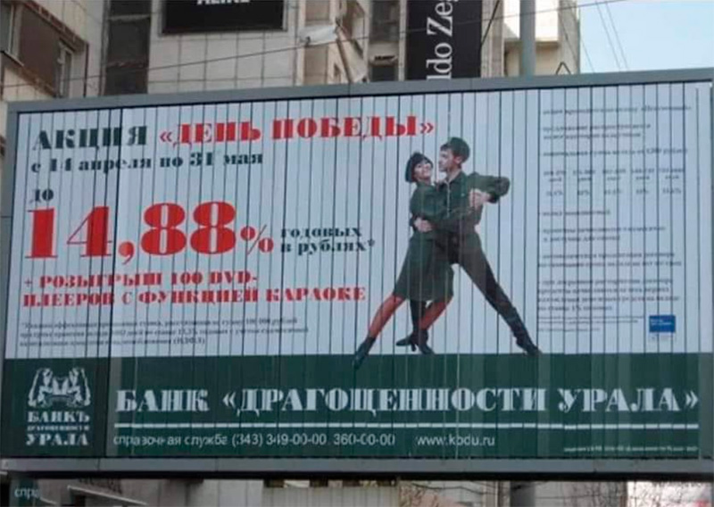 Ева пытается понять, что именно означает данный креатив и почему 14,88% - это акция к "Дню победы".