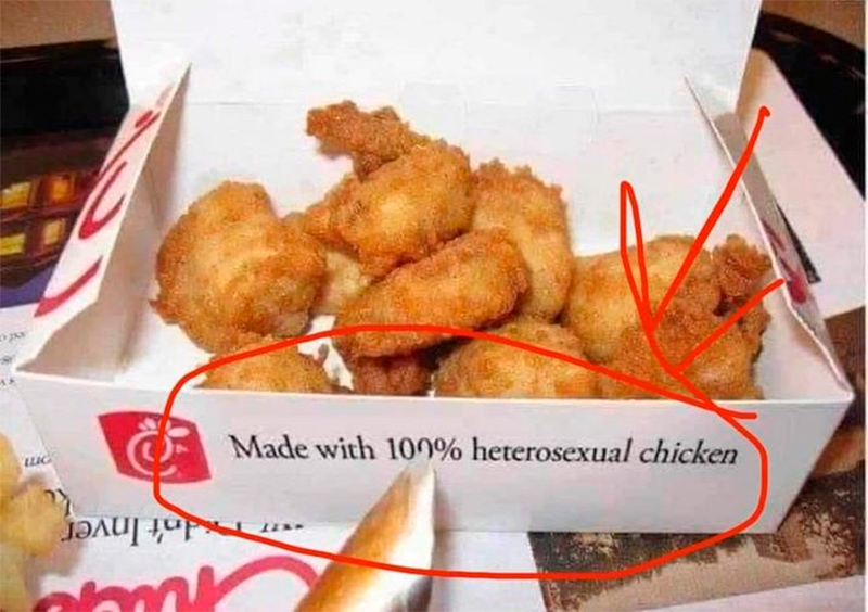 А наггетсы он всегда делает из стопроцентно гетеросексуальных цыплят