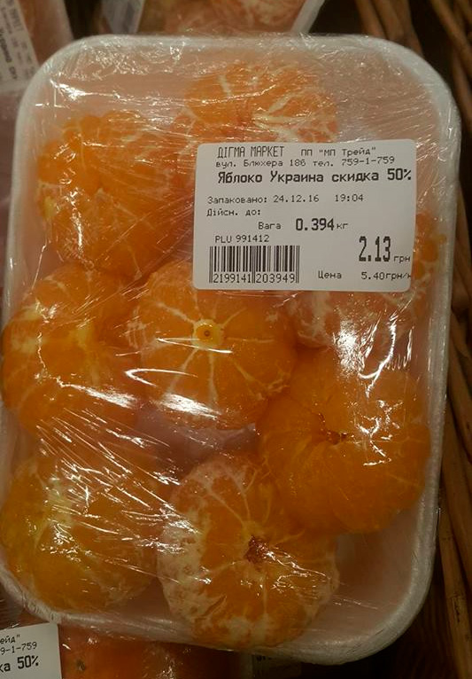А почему на яблоках страна с ошибкой написана: Україна же должно быть? Какой-то москаль-диверсант завелся, поди там рядом "Россия" и "Белоруссия" на ценниках есть.