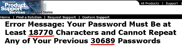 Нет, у Макса нет никаких возражений - хозяин-барин, - однако ему было непросто проверить предыдущие 30689 паролей, чтобы они не совпадали с его паролем, состоящим из 18770 символов. Все-таки, этот Майкрософт иногда требует довольно сложных вещей.