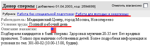 Работа, как вы понимаете, для молодых и весьма энергичных. Специальной подготовки не требуется. Справка об окончании курсов энергичных доноров спермы - также не требуется. В общем, вполне интересное предложение...