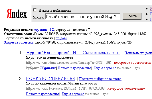 Уровень релевантности поиска "Яндекса", восхищается Sofie, превосходит все мыслимые и немыслимые пределы...