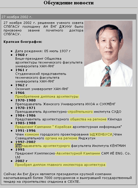 Классный мужик этот Енг Джун, да? Два диплома приобрел (значит, состоятельный человек), в стройтельном институте преподавал (видать, для военных), в комисии проектировал ЫДЖЕНБУСИ (я это даже выговорить не могу, а он проектировал), ну и в совещательном органе совещался по поводу Ав-Хитектурной Кампании - пришибить ее или пусть живет.