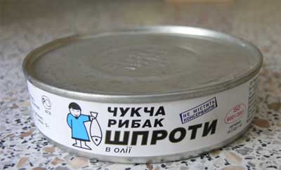 Но если цукерка хоть не вызывает сомнений в содержимом, то вот эти консервы - сплошная загадка! Что в них законсервировано? Чукча? Рыбак? Или все-таки шпроты?