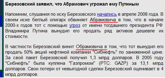 Этот Березовский совсем зарапортовался, считает Фарид Вагапов. Сначала обвиняет Абрамовича в том, что тот угрожал ему от имени Путина. Потом требует у какого-то Обрамовича четыре миллиарда. Все это звучит редкостным бредом. Потом, что, Путин - не мужик, что ли? Что, он сам не мог угрожать Березовскому? В общем, все это какая-то обра-абра-обракадабра.