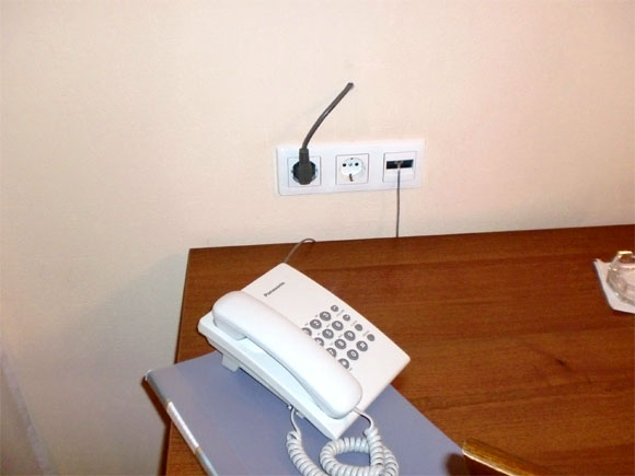 В стене сделано технологическое отверстие и из соседнего номера за стенкой протянут шнур с вилкой в эту розетку...