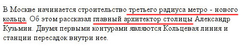 В принципе, считает Сергей, главному архитектору столицы можно и не знать, что радиус - это отрезок, соединяющий любую точку окружности с ее центром. А строить они вроде как собираются новое кольцо. Почему двумя первыми контурами является Кольцевая и, внимание, станции пересадок внутри нее - это надо спросить у журналиста, который писал заметку, судя по всему, не приходя в сознание. Но в газете "жЫзнь" - все такие. Очень альтернативно одаренные. Гордо несут высоко поднятое знамя говножурналистики.