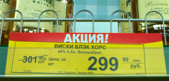В магазине "Пятерочка", рассказал Андрей, акция неслыханной щедрости! Мало того что они продают какое-то жуткое пойло под видом "британского виски", так они еще на него и цену на рупь десять скинули! Налетай, народ, приобретай задешево жуткий похмелон на завтра!
