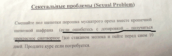 То есть выпиваете это дело - и дрыхнете, как убитый. И никакие сексуальные проблемы вас, разумеется, уже не волнуют! Правда, не очень понятно, где взять этот мускатрый орех...