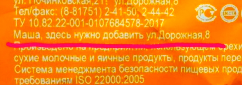 Конфетный фантик с "Маша, здесь надо добавить улица Дорожная" у меня тоже есть. Сохранил на память.