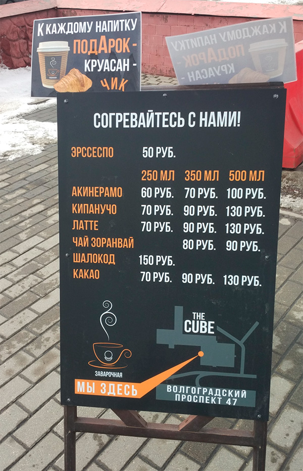 Евгений всячески завлекает посетить эту кафешку. Акинерамо - совершенно божественный, особенно шелуха лука мякость вчерашней булки. Кипанучо на скисшем молоке - шедеврален, но нужно находиться недалеко от удобств. Что среди такого великолепия делает банальное латте - непонятно, но зато чай зоранвай с полынью и зароастрийскими лапиздрунчиками - хорош чрезвычайно. Шалокод - для сильных духом кодеров, которые могут хорошо пошалить. А какао - опять какая-то скучная пошлятина. Хорошо хоть круасан к нему дают. Чик.