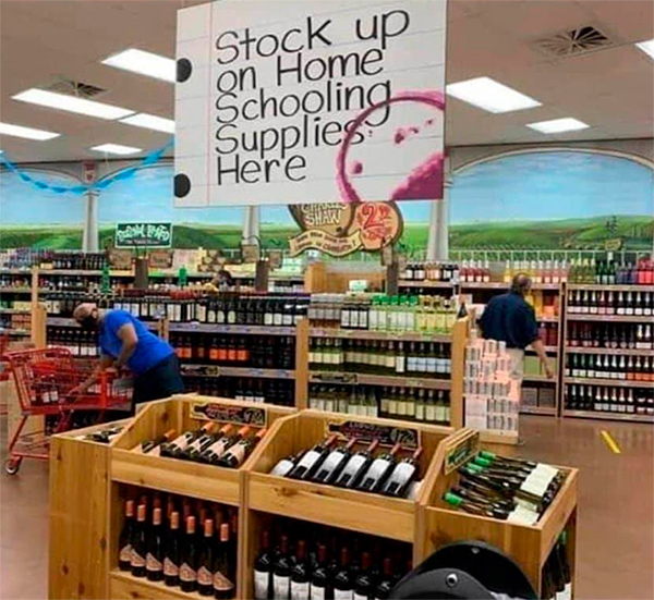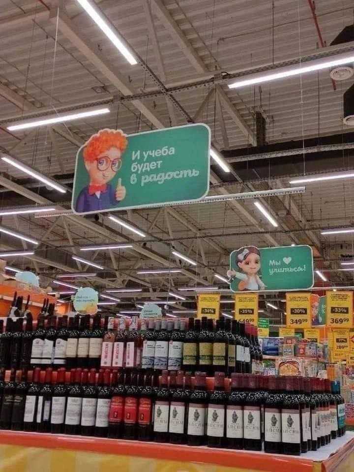 Американцы, кстати, в этом деле тоже знает толк, уверяет Виктор. Надпись: "Запасайся необходимыми принадлежностями для домашнего обучения здесь!"