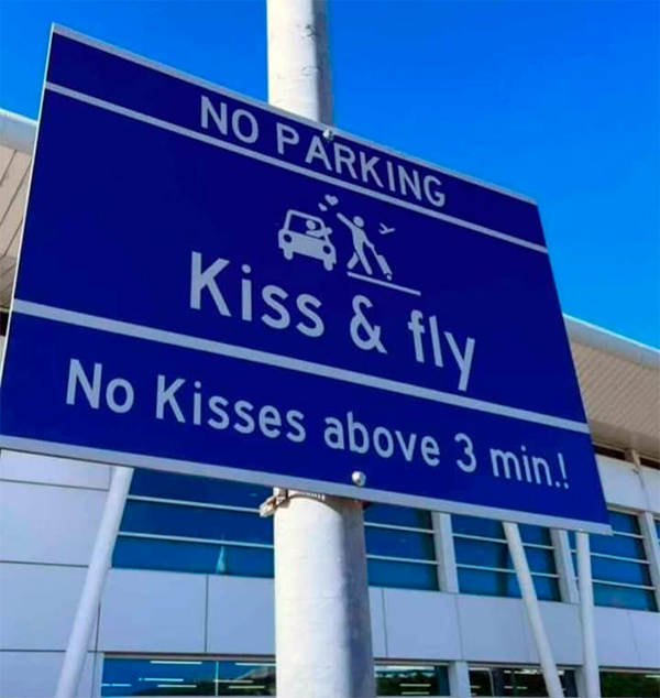 Зона высадки пассажиров в Princess Juliana International Airport, St.Maarten, рассказал Андрей. Надпись на знаке: "Не парковаться. Поцелуйтесь и улетайте. Не целоваться больше 3 минут!"