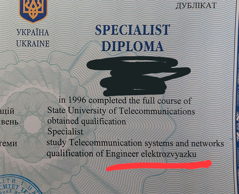С "engineer elektrozvyazku" ситуация ж достаточно простая. Это академическое звание. Оно не переводится. Я когда свой диплом в Германии подтвердил, мне выдали удостоверение, что у меня действительно есть академическое звание "Ingener elektonnoj techniki", которое соответствует немецкому Elektronikingenieur.
