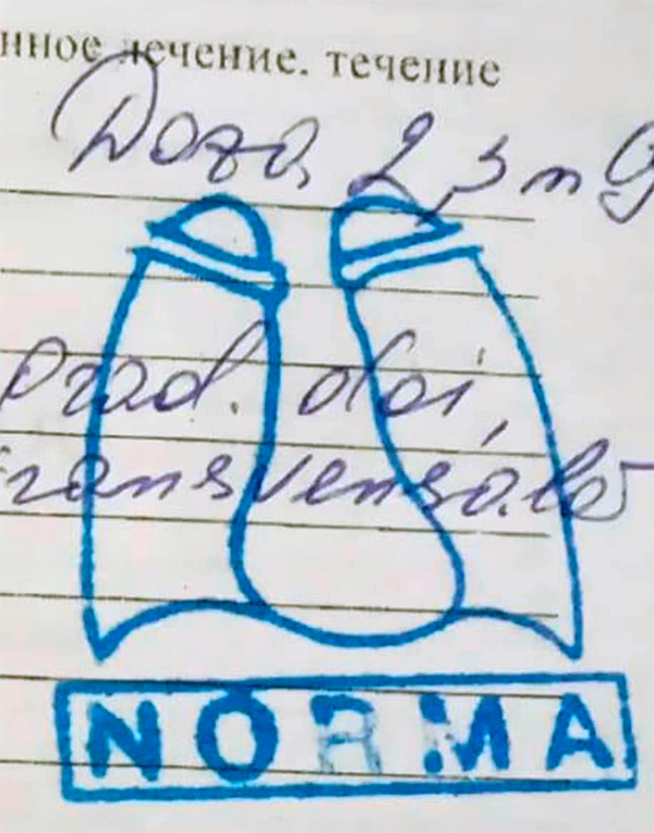 Логотип - рентгеновский снимок грудной клетки, видно лёгкие, сердце и ключицы. Ну и всё это на бланке рентгеновского обследования. Но у дизайнера руки всё равно не оттуда растут.