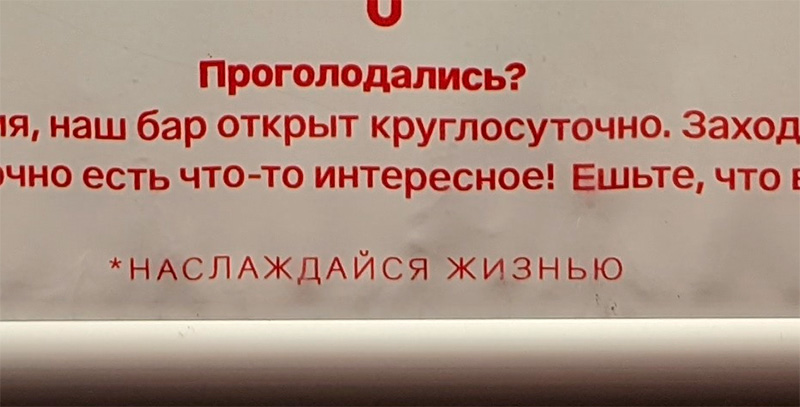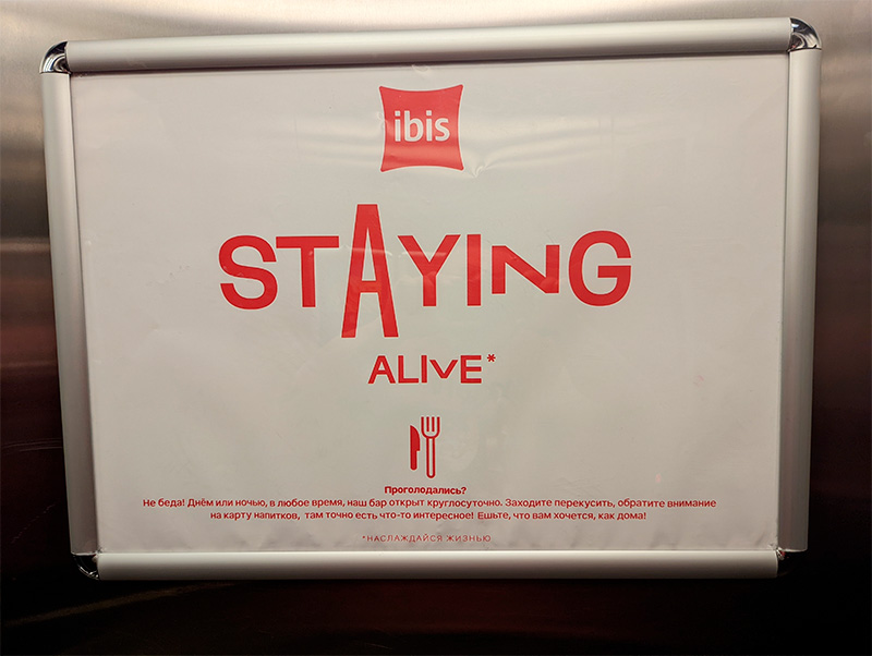 Евгений вынужден разочаровать этих прекрасных людей из гостиницы Ibis. "Наслаждайся жизнью" - это вовсе не staying alive. Staying alive - это "оставаться в живых". Видимо, они таким образом намекают, что после посещения этого бара у вас есть все шансы выжить.