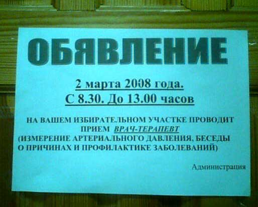 Администрации, которая повесила обЪявление про врача на избирательном участке, нужен учитель русского языка, а не врач (хотя возможно окулист тоже мог бы решить проблему).