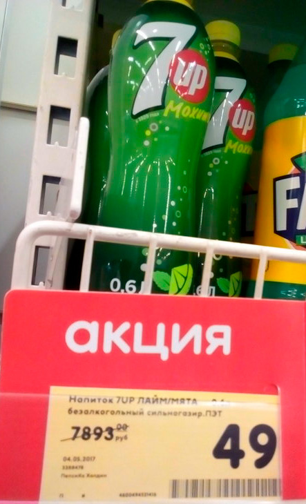 Что-то они нас, клиентов, уж совсем за идиотов держат, возмущается Гена Крокодил. Есть железный закон. Вот товар стоимостью в 40 рублей. Берешь картонку "Акция", пишешь цену "60 рублей", зачеркиваешь. Рядом пишешь "49 рублей". Все довольны. А эти 7893 - это что за безобразие?