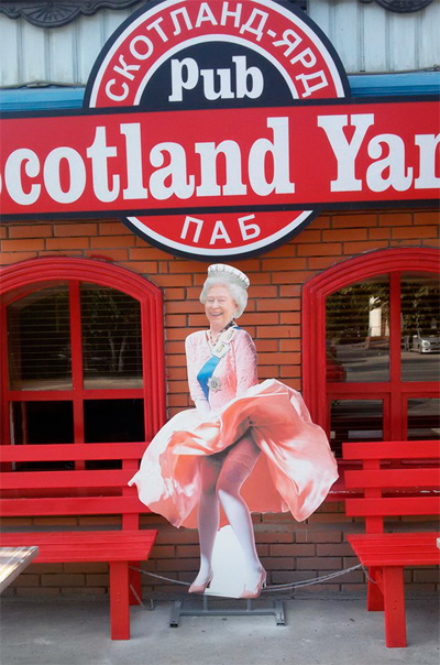Какой же "настоящий британский паб" в России обойдется без оскорбления ее величества королевы Великобритании, замечает Мират? Да еще и "Скотланд-ярд"! Но, впрочем, скажем спасибо, что хоть в виде Мэрилин Монро, а не Верки Сердючки.