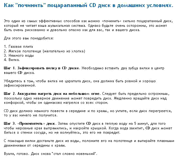 Кстати, лажа полная. Всем известно, что диск перед этим нужно сначала прокрутить через мясорубку - он тогда станет мягкий и царапины совершенно пропадут. Впрочем, диск после кипячений можно кушать и так, как показывает практика.