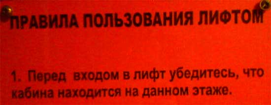 Но я бы все-таки первым пунктом поставил следующий: "Перед входом в лифт убедитесь, что в этом здании лифт вообще есть".