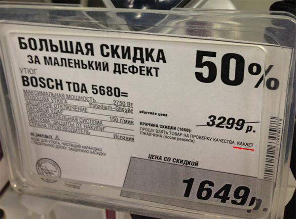 Коту Бублику очень понравилась фраза "Большая скидка за маленький дефект". Малю-ю-юсенький дефект, от которого утюг будет навсегда портить любую вещь, которую с его помощью погладят. Маркетологи - они такие маркетологи...