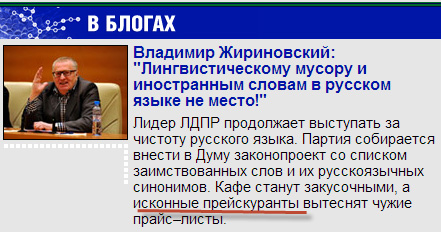 А самое забавное, что это не анекдот, а слова из реального выступления того же самого Жириновского несколько лет назад, когда промелькнула первая кампания борьбы за чистоту русского езыка. Настоящий клоун всегда верен себе.
