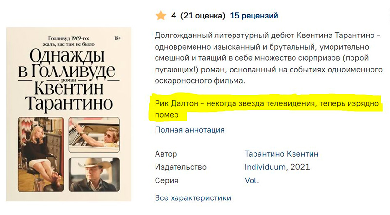 В книжный магазин "Лабиринт", рассказал Polem, поступил роман Квентина Тарантино о жизни и судьбе Рика Далтона.