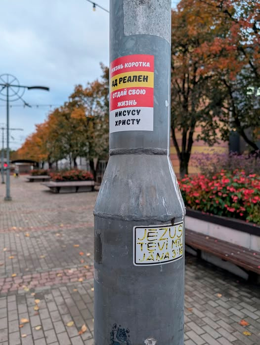Два мира - два Шапиро, вздыхает Дмитрий. Надпись на русском: "Жизнь коротка. Ад реален. Отдай свою жизнь Иисусу Христу". Надпись на латышском: "Иисус любит тебя".