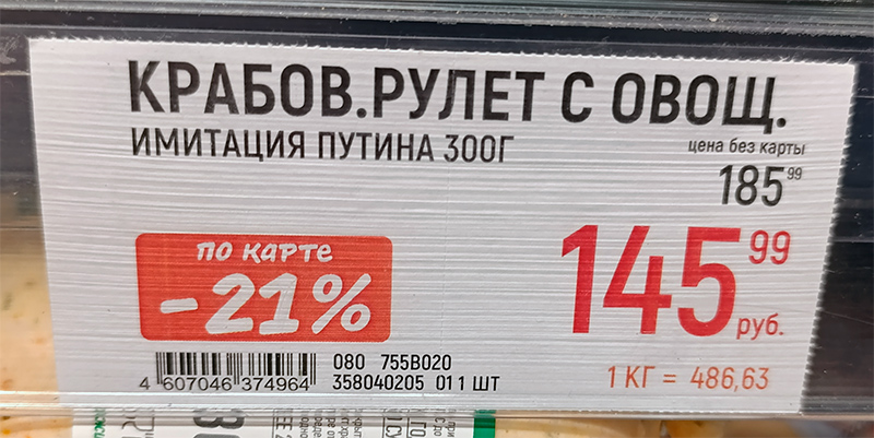 Dao1972 мучительно пытается понять, в чем смысл фразы "ИМИТАЦИЯ ПУТИНА" в крабовом рулете.