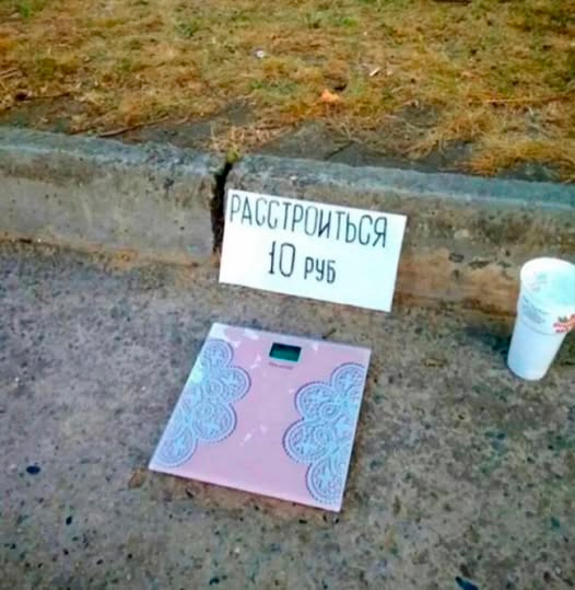 Но вообще мужик не въезжает, считаем мы с котом Бубликом. Ему надо настроить весы так, чтобы они показывали вес на 10 кило меньше. Цену поставить в 100 рублей и на картонке написать "Порадоваться". Это же очевидное решение!