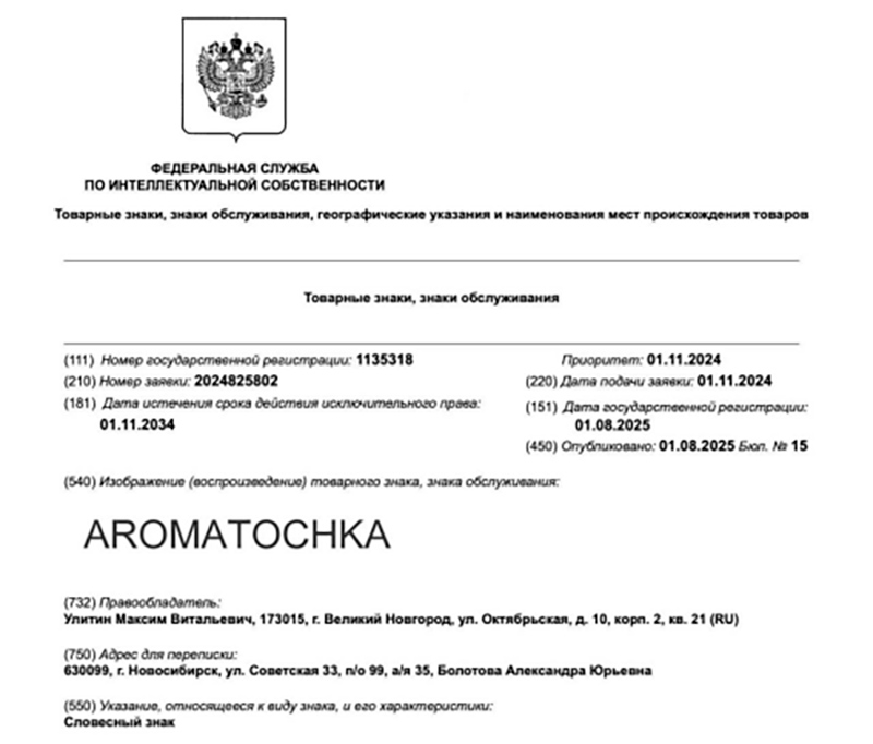 Бизнесмен Улитин, рассказал Andrevv, зарегистрировал товарный знак Aromatochka. Не только зарегистрировал, но под этим брендом уже продает какие-то вонялки. Сам бизнесмен утверждает, что бренд расшифровывается как AROMA TOCHKA, а интерпретацию AROMAT OCHKA решительно отвергает.