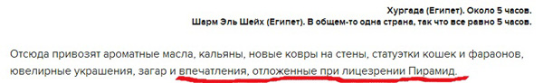 Да, бывает, замечает Юлия: некоторые туристы при лицезрении пирамид откладывают впечатления. Но с собой-то это зачем потом тащить?