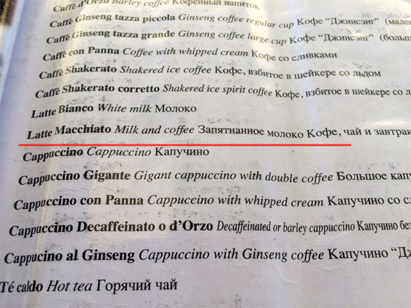 Какая-то сермяга, замечает Наталья, в этом есть: латте маккьято - это действительно кофе, запятнанное молоком.